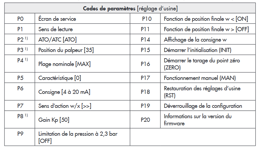 Ces positionneurs ont un nombre limités de paramètres (20) ce qui les rends simples a utiliser. Ci-dessous le tableau de ces paramètres.