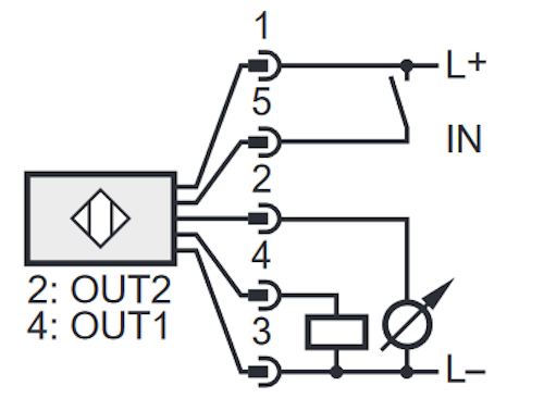 Branchements pour une configuration analogique pour la sortie 1 et TOR pour la sortie 2.