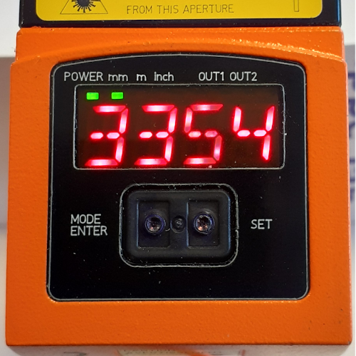 Configuration du laser IFM O1D100, capteur permettant de fournir un signal 4-20mA selon la distance mesurée. Les distances mini et maxi sont paramétrables dans le menu.