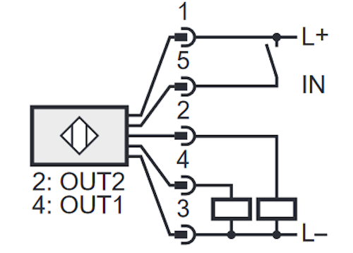 Branchements pour une configuration des 2 sorties en "Tout ou rien" configurables en NO ou NC.